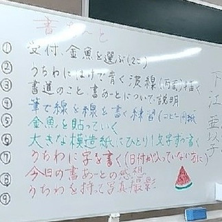 うちわに青い絵の具で波を表現、金魚の切り紙を貼って、さあここにも好きな字を書くよー